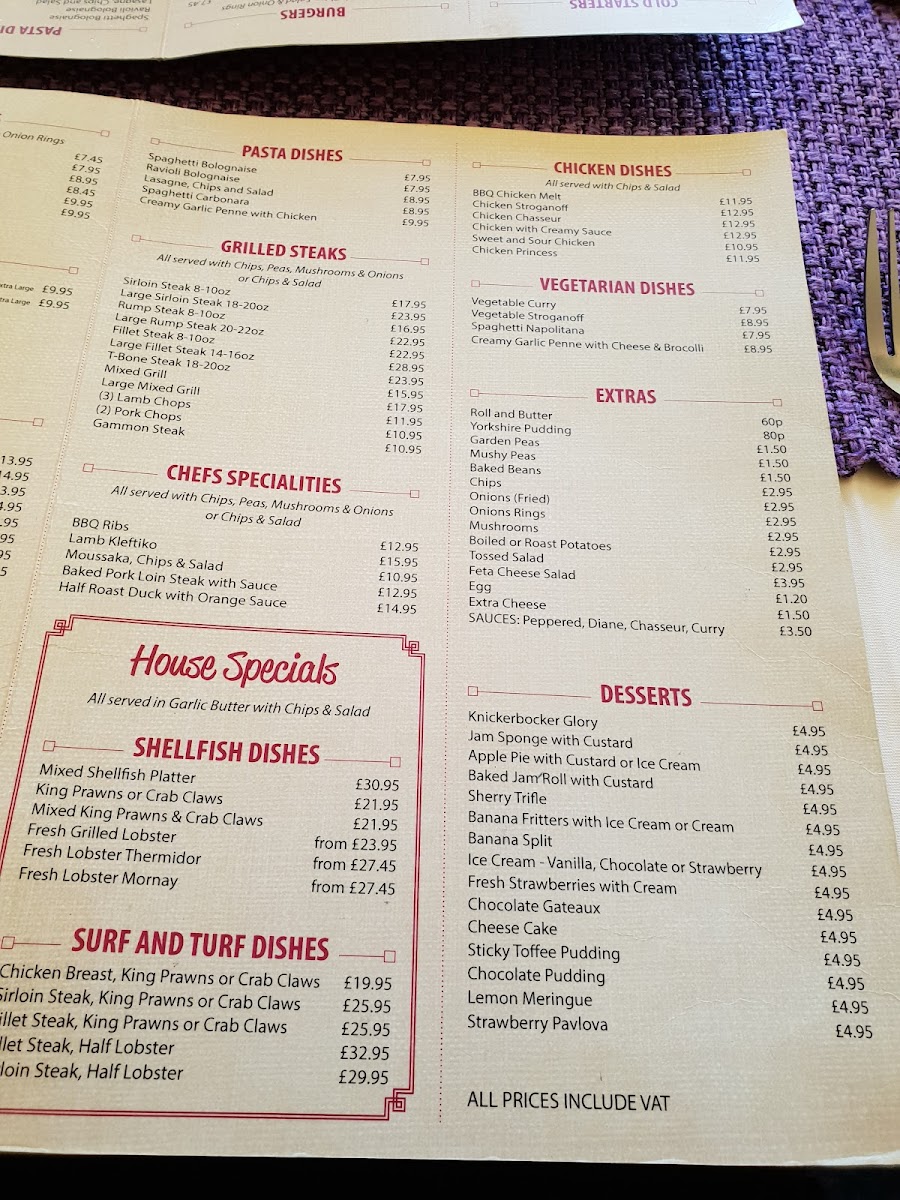 The dessert selection is a true highlight, showcasing classics such as Apple Pie with Custard, Chocolate Gateaux, and tangy Lemon Meringue—all crafted to satisfy any sweet tooth.